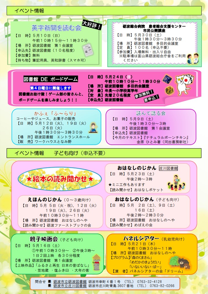 | 日 時:5月24日(日) 午前10時10分~11時30分 場 所:砺波図書館 多目的会議室 対 象:年長~小学校高学年 申 込:必要 申込先:砺波図書館(先着20名程度) 参加費:無料 |