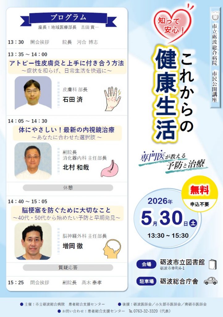 | 日時:5月30日(土)13:30~15:30 場所:砺波図書館 多目的会議室 申込:不要 駐車場:砺波総合庁舎 入場無料・出入り自由 13:35~14:00 ①アトピー性皮膚炎と上手に付き合う方法 (皮膚科部長 石田 済 先生) 14:05~ 14:30 ②体にやさしい!最新の内視鏡治療 (副院長 消化器内科主任部長 北村 和哉 先生) 14:40~15:05 ③脳梗塞を防ぐために大切なこと (脳神経外科主任部長 増岡 徹 先生) |