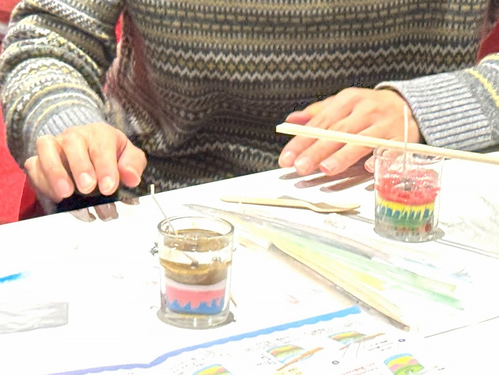 ゼリーキャンドルは、グラスの中にカラフルな砂を入れてゼリーで固めます。
