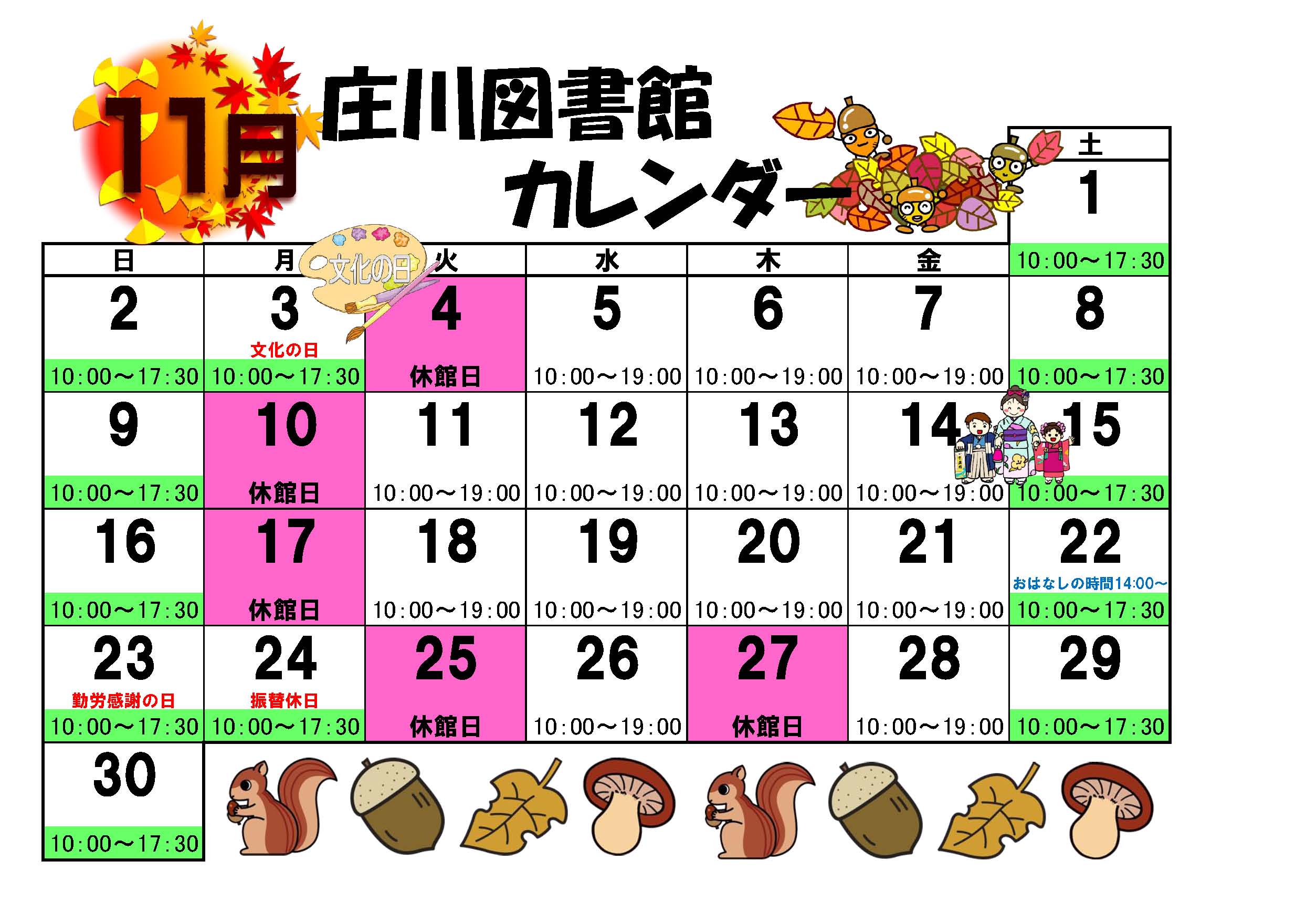 庄川図書館11月のカレンダーです。ご利用時の参考にしてください。