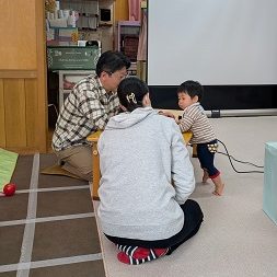 歯の健康について学んだあとは、支援センターの職員と皆さんとで親子のふれあい遊びを楽しみました。
