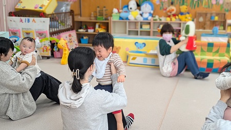 保護者のお膝に乗せて、「高い山、低い山♪」うたに合わせて弾んだり、転がったり♪