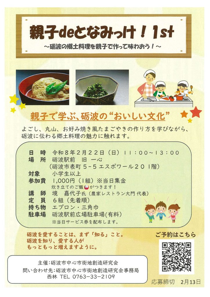 今回は「親子で砺波の郷土料理を作って味わう!」をテーマに実施。参加した親子が地元の食文化に触れ、楽しみながら料理に挑戦する姿が見られ、会場は大いに盛り上がりました。