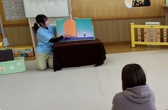大型絵本を読み聞かせていただいて見入るこどもたち。