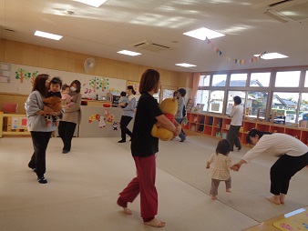 今回は、まだ歩いてないお子さんの参加も多く、親子でふれあいながら楽しく体を動かしました。