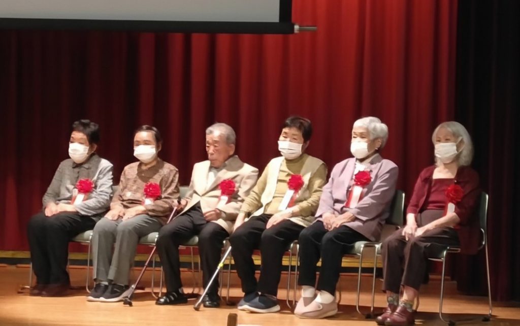 まず、最高齢継続参加者として、94歳~95歳の6名を表彰し、皆さん壇上に上がり表彰状を受け取られました。