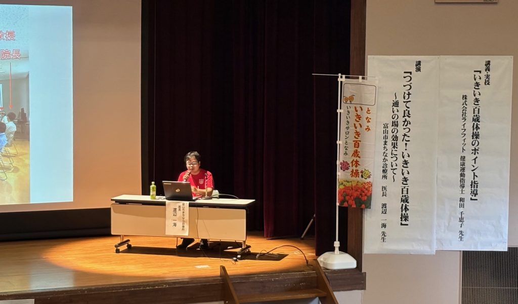 富山市まちなか診療所の医師 渡辺一海先生をお招きし、砺波市の「いきいき百歳体操」への参加による効果に関する調査・分析結果についてご講演いただきました。