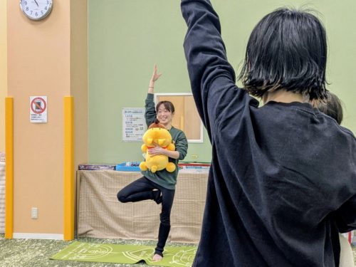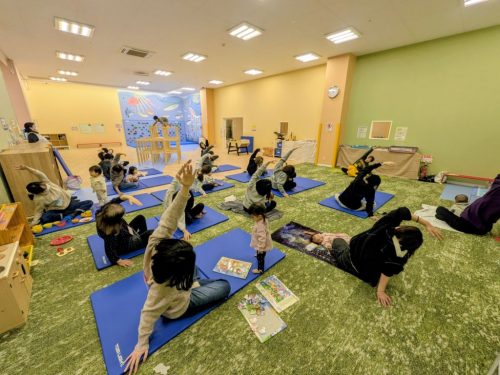 こども子育て交流館「こどもおーる」内の支援センターで初めて講師を招いたイベント「親子でヨガ」を開催しました。親子13組が参加され、お子さんは3か月から2歳前後の幅広い年齢の方が参加されました。