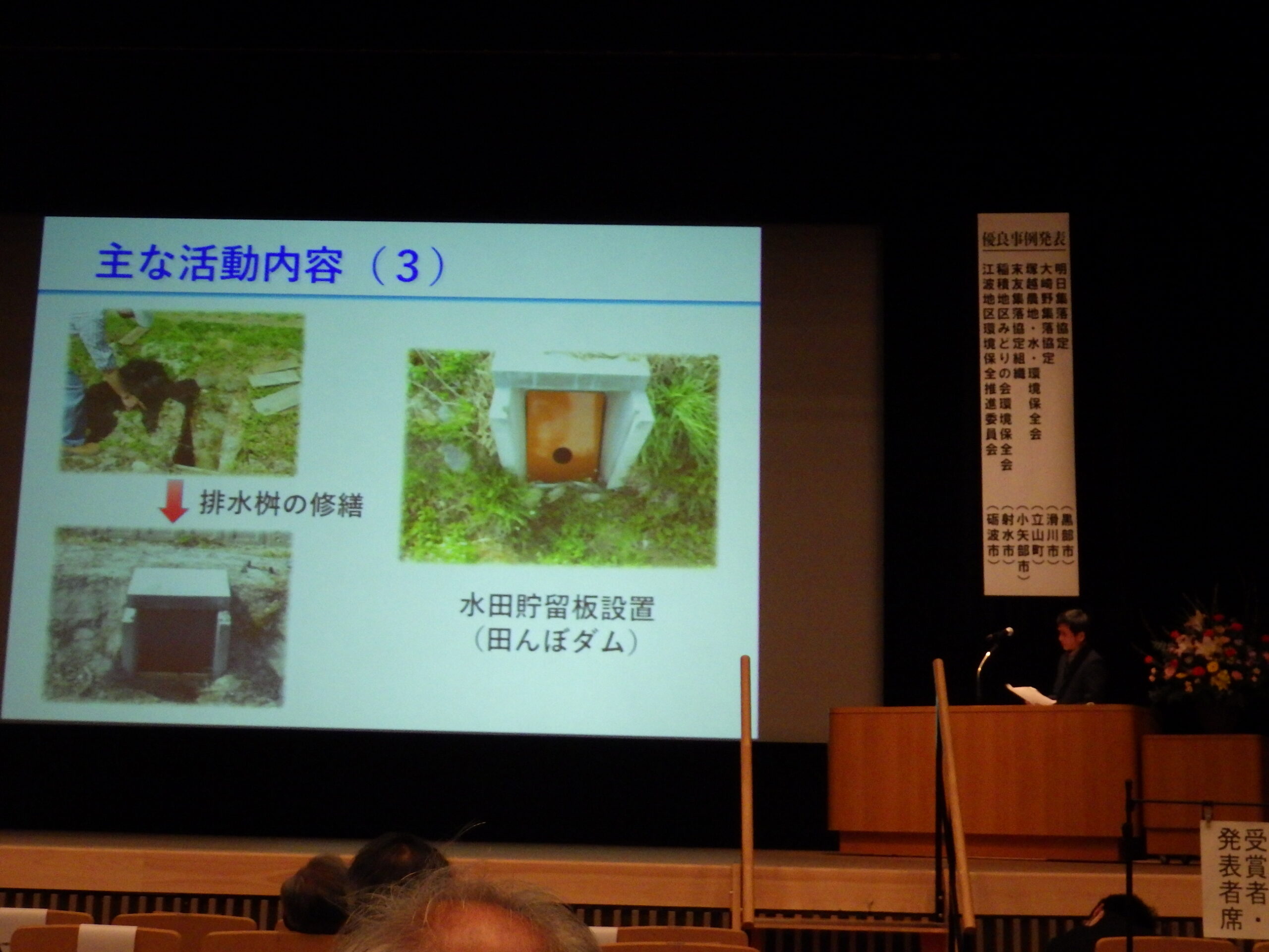 江波地区環境保全推進委員会は農道や水路の維持管理活動以外に、女性グループによる緑化活動や近年多発する豪雨の洪水軽減対策として「田んぼダム」に取組んでいることが高く評価され知事賞を受賞されました。