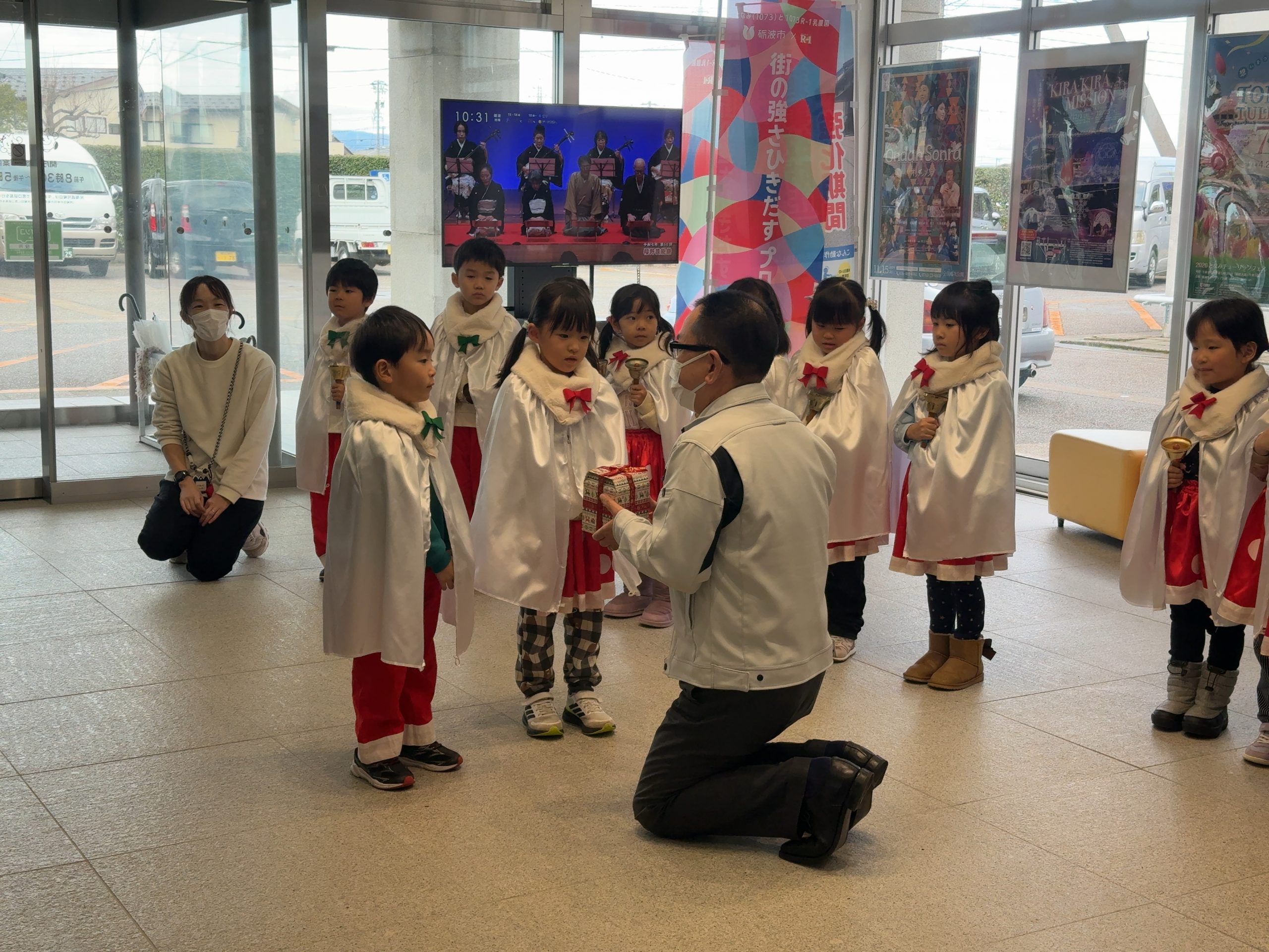 12月16日(火)に、ろば組(年長)のみなさんが横山福祉市民部長に募金箱を手渡しました。寄付されたお金は、砺波善意銀行の事務局である砺波市社会福祉協議会へお渡ししました。