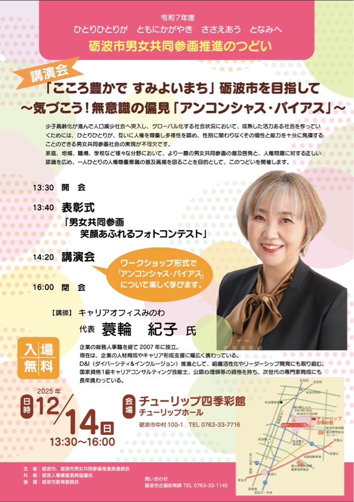 家庭、地域、職場、学校など様々な分野において、より一層の男女共同参画の普及啓発と、人権問題に対する正しい認識を広め、一人ひとりの人権尊重意識の普及高揚を図ることを目的として、このつどいを開催します。
