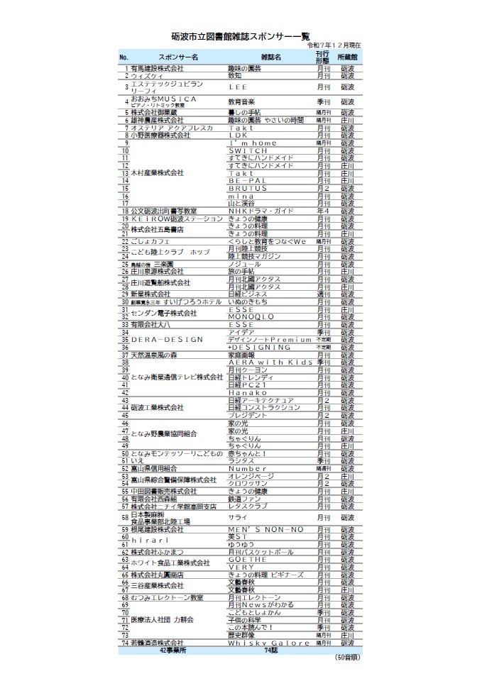 対象となる雑誌、スポンサー広告掲載基準など、詳しくは砺波図書館までお問合せください。