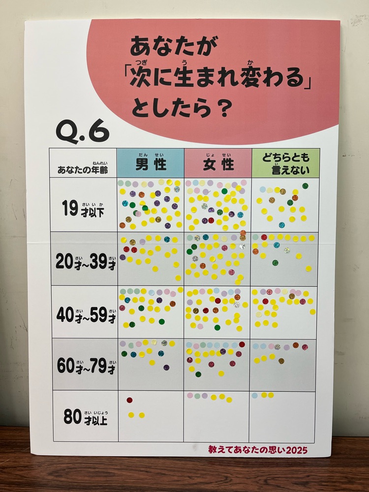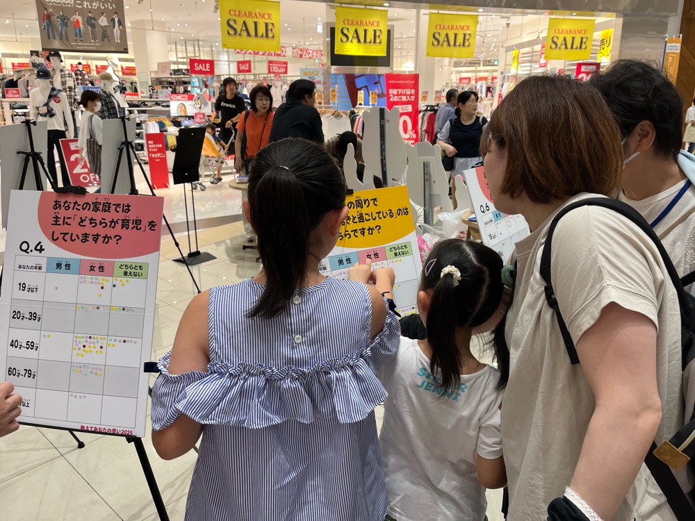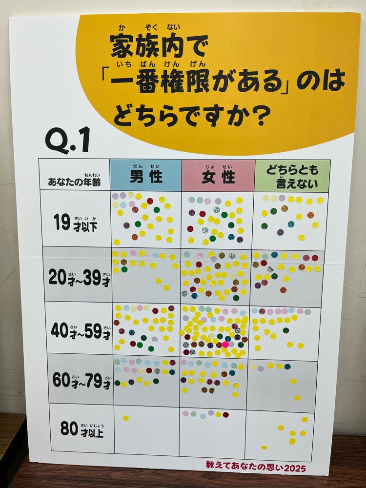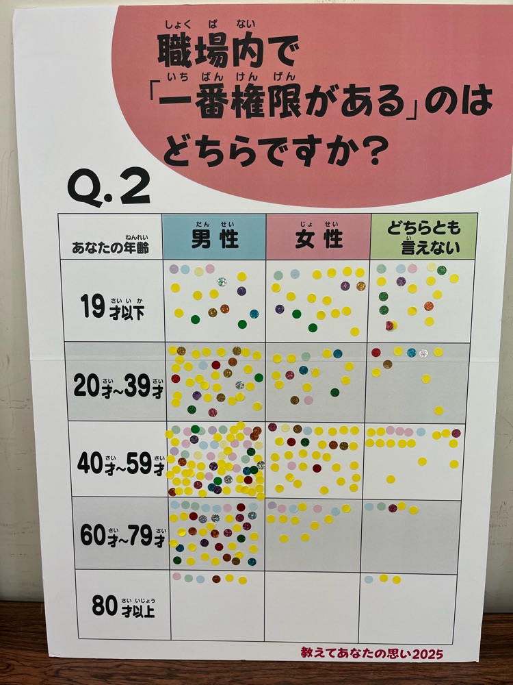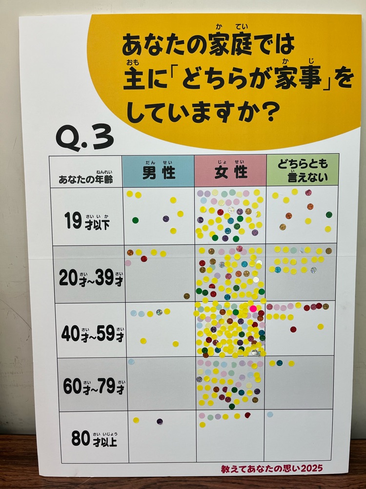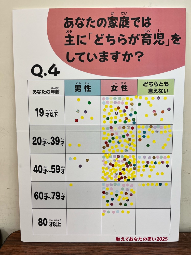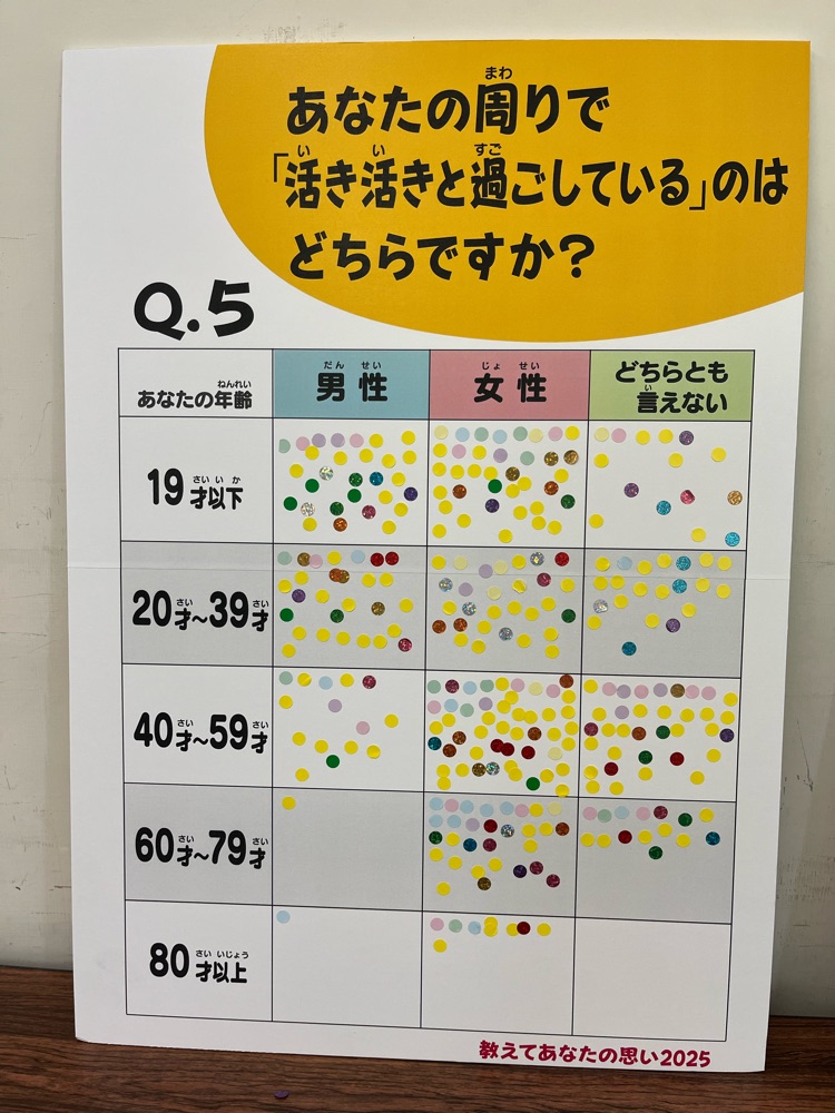 いろいろな年代の方の考えを知ってもらい、自身に内在するアンコンシャス・バイアス(無意識の先入観)に気づいてもらうため、自分の意見に当てはまる箇所にドットシールを貼ってもらう、簡単なアンケートを実施しました。