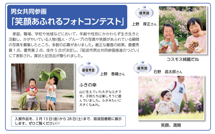 このコンテストは、「イクメン・カジダン」に対する理解を深め、職場優先になりがちな男性の働き方の見直しや男性の家事・育児参画の機運を一層醸成するために、市民の方を対象に砺波市と砺波市男女共同参画推進員連絡会が協働で実施しました。