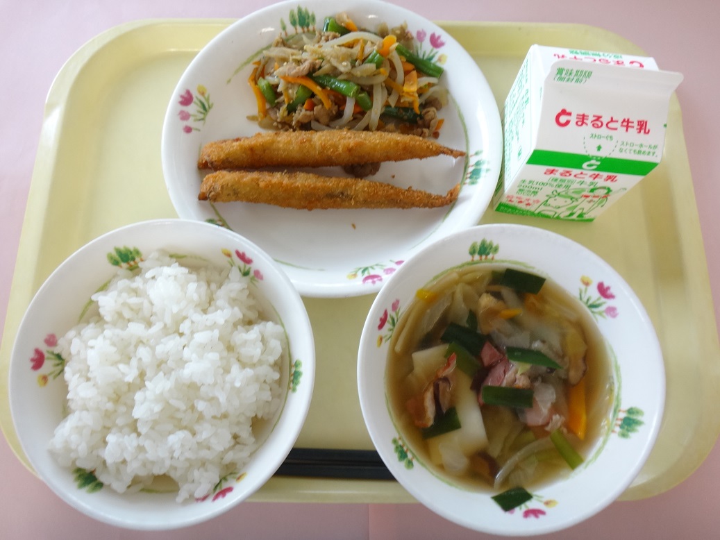 ごはん、牛乳、シシャモフライ、きんぴらごぼう、ワンタンスープ