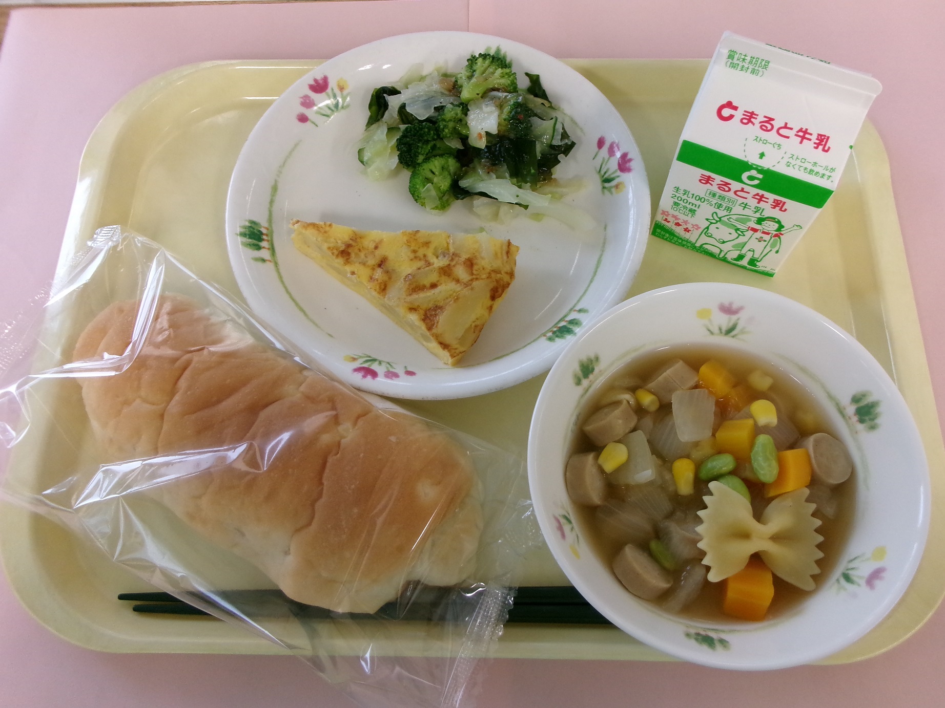 アップルパン、牛乳、アンサンブルエッグ、アリエルのサラダ、海の宝石箱スープ