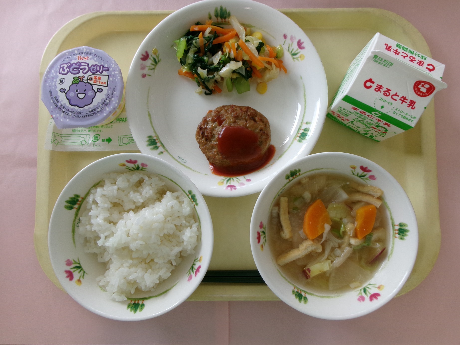 ごはん、牛乳、ハンバーグのケチャップソース、青菜のコーンあえ、秋野菜のみそ汁、わくわくデザート