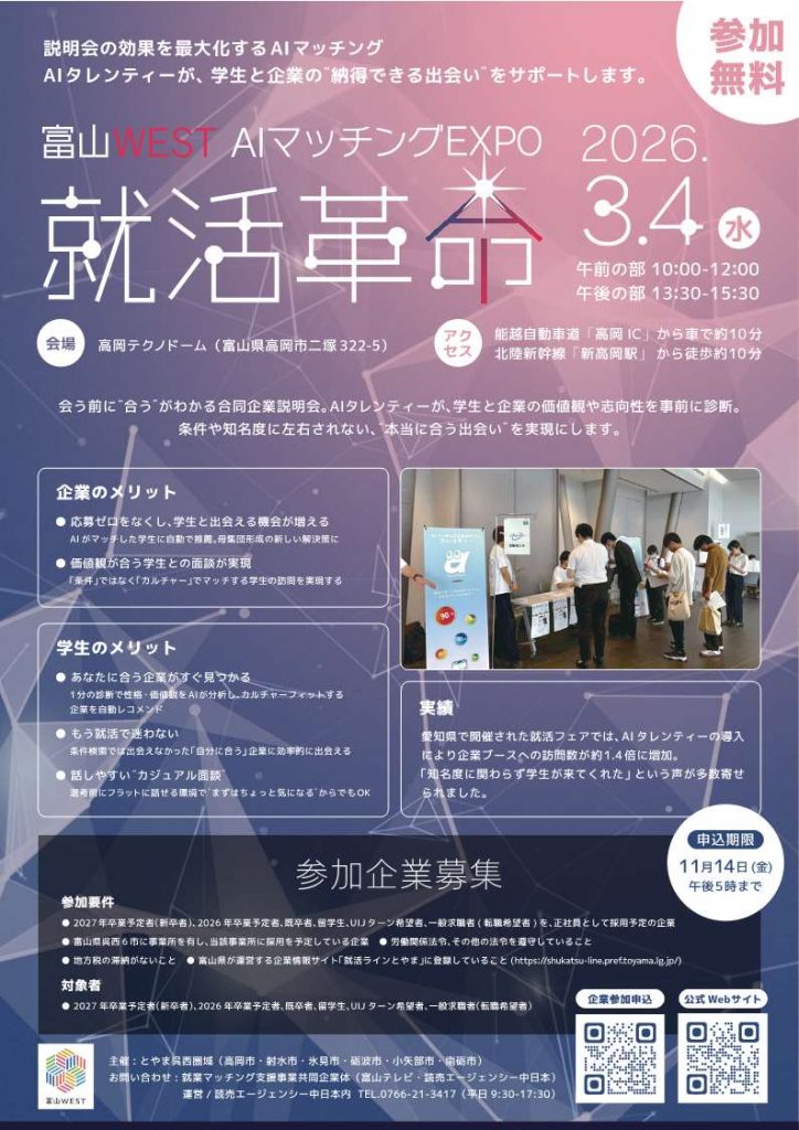 県西部6市(とやま呉西圏域)が連携して開催する合同企業説明会『富山WEST「AIマッチングEXPO 就活革命」』に出展する企業を募集します。