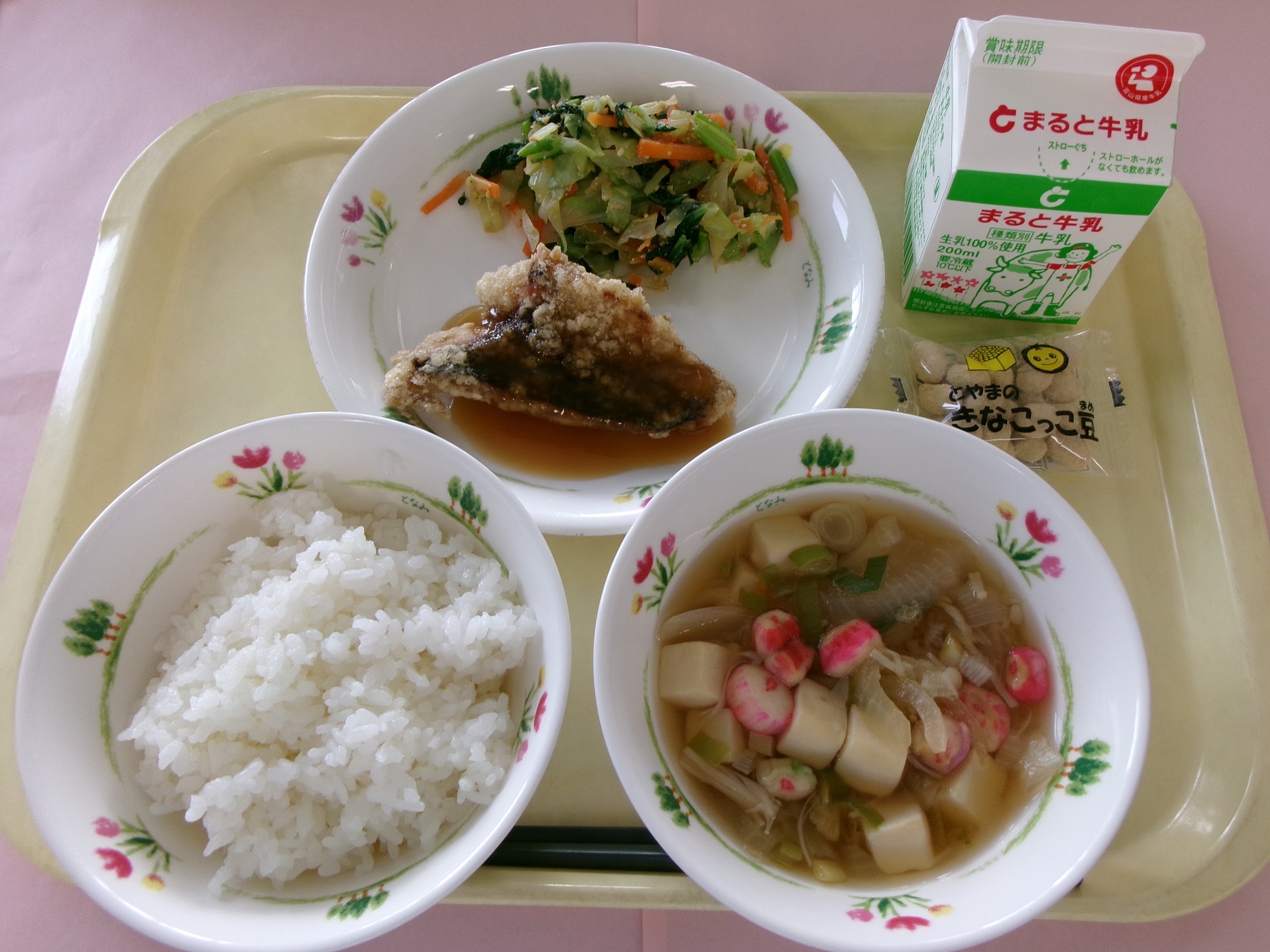 ごはん、牛乳、アジのかば焼き、ごまひたし、すまし汁、きなこ大豆