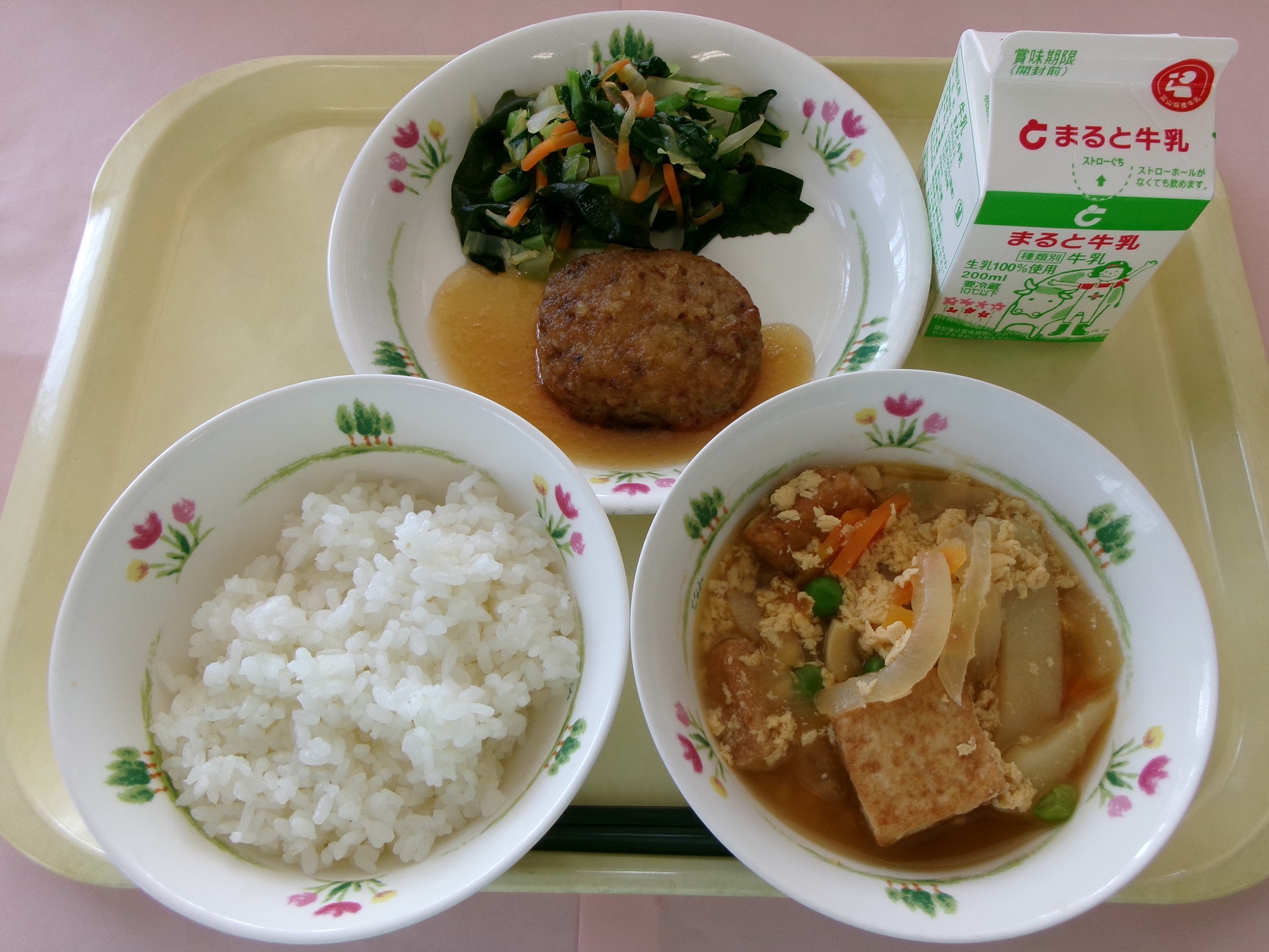 ごはん、牛乳、ハンバーグのおろしソース、わかめ入りひたし、厚揚げの錦とじ