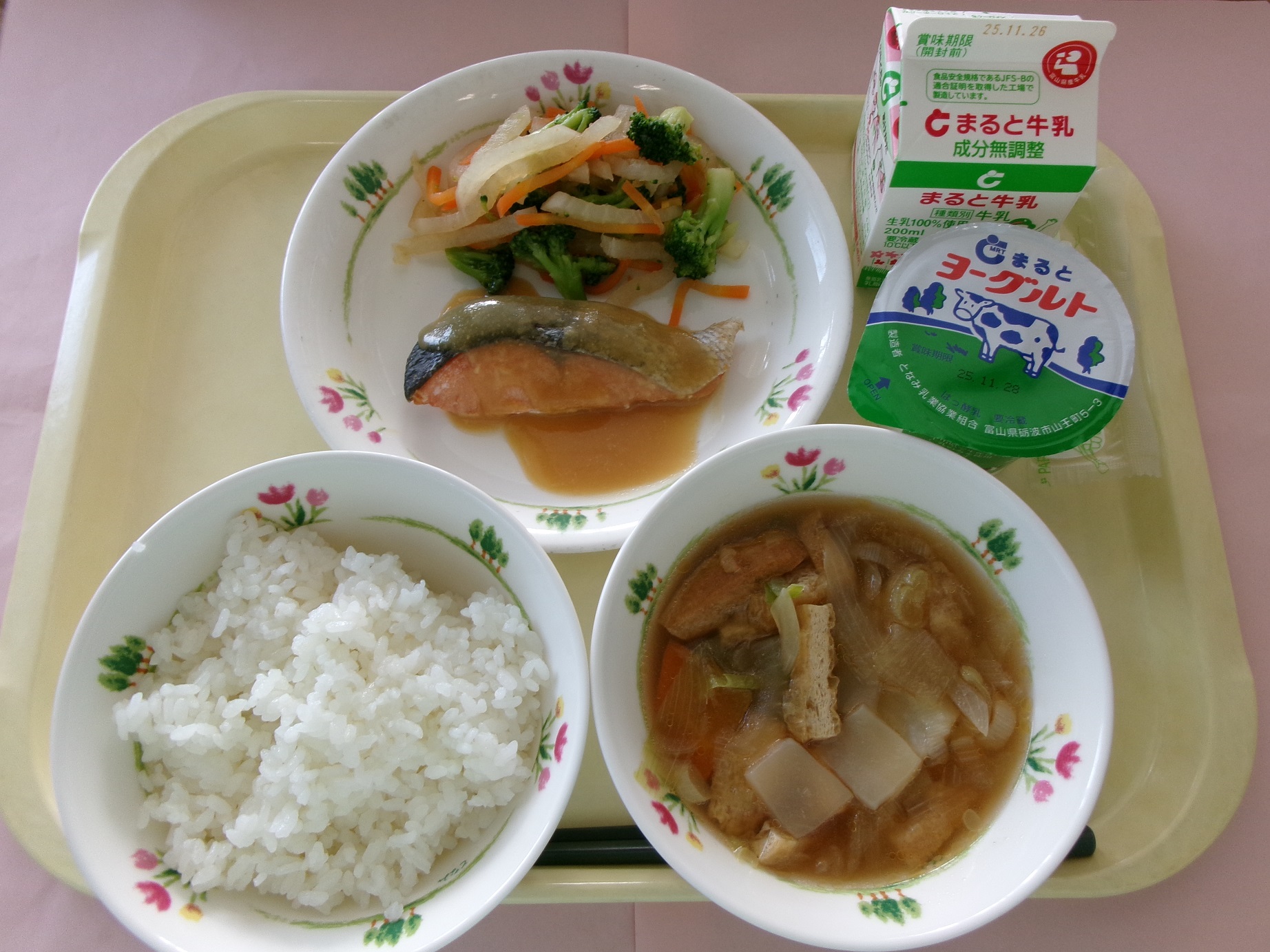 今日は「学校給食となみの日」です。砺波市で作られた食材が、たっぷり使われています。サラダの大根、のっぺい汁のたまねぎと里いもは、砺波市でとれたものを使いました。また、ゆずみそや、たまねぎドレッシング、牛乳、ヨーグルト、米も砺波市で作られたものです。地元でとれた新鮮な食材を食べられることに感謝して、おいしくいただきましょう。