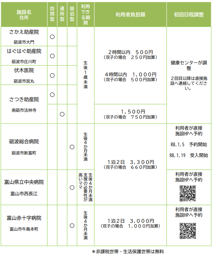 砺波市に住民票がある生後1年未満の赤ちゃんとそのママ(但し、宿泊型は生後4か月未満)