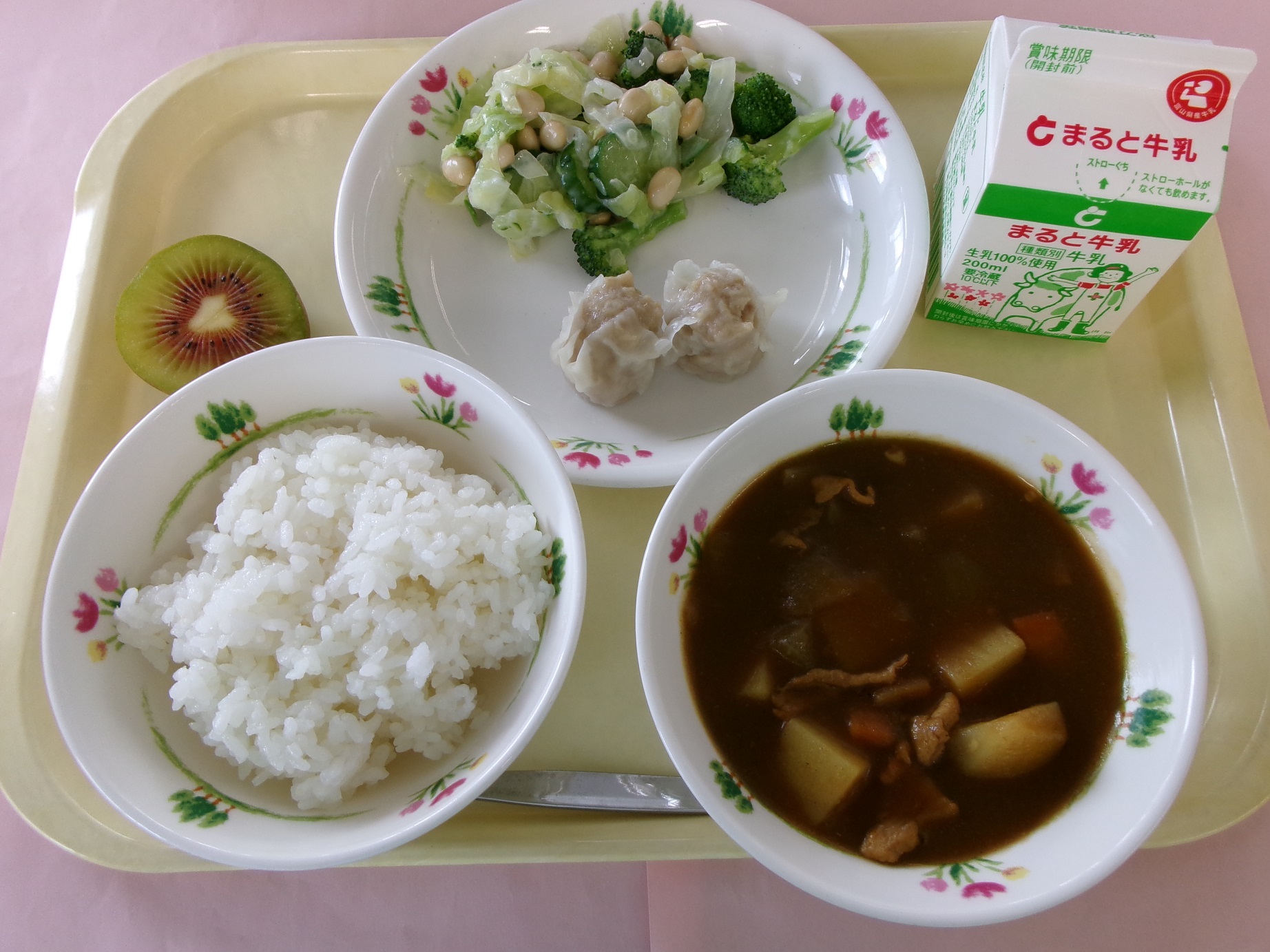 ごはん、牛乳、ポークシュウマイ、大豆サラダ、カレー、レインボーレッドキウイフルーツ