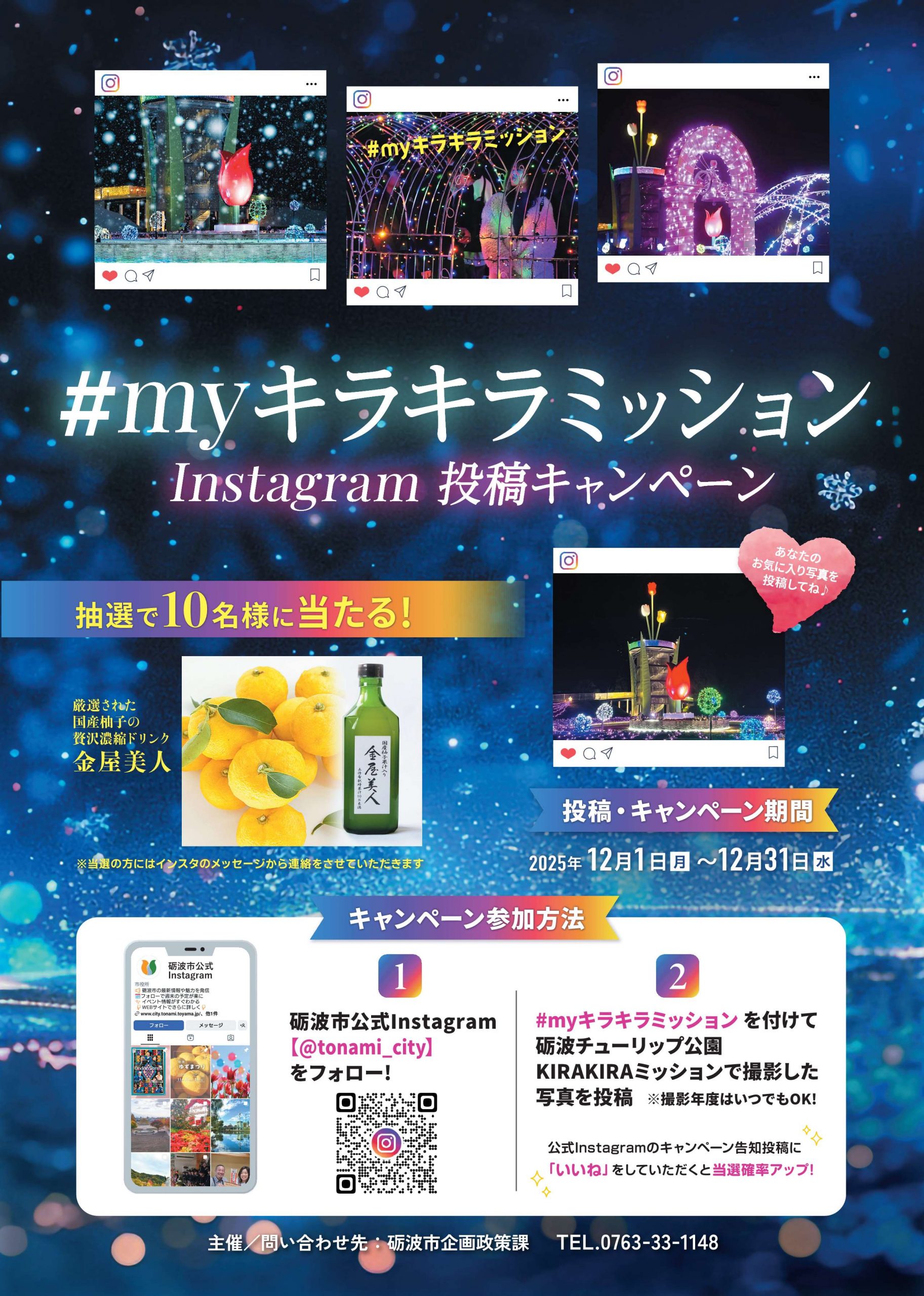 砺波市では、本市の魅力ある行事や地域資源を市内外に広く発信し、砺波市の理解者・応援者の拡大につなげることを目的として、市公式Instagramプロモーション事業の一環となる投稿キャンペーン「#myキラキラミッション」を実施します。