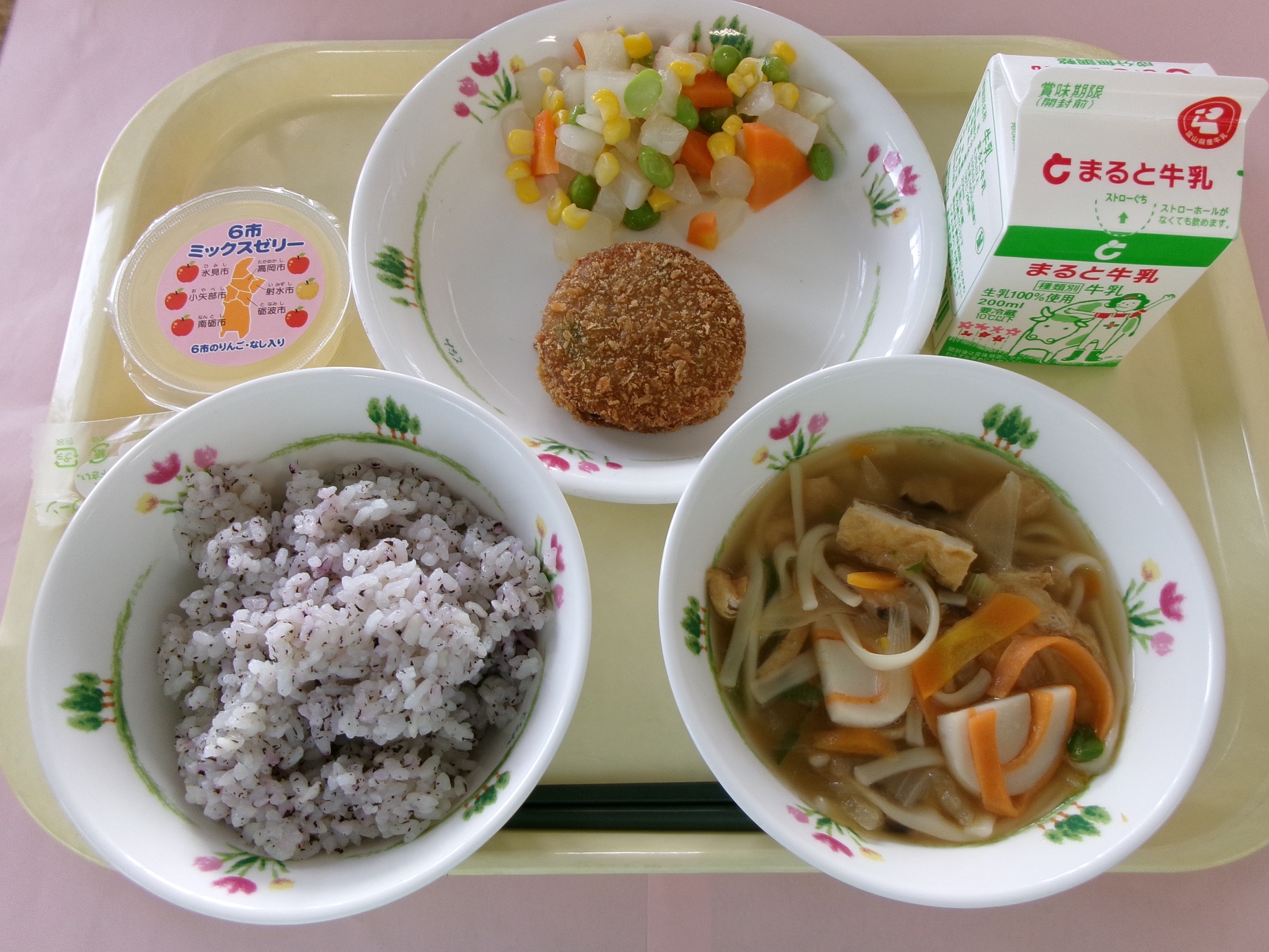 ハトムギ入りしそごはん、牛乳、ゴーセイなメンチカツ、枝豆サラダ、氷見うどん汁、6市ミックスゼリー