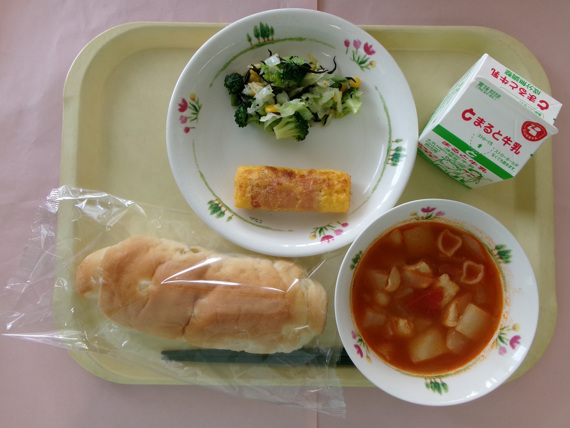 パインパン、牛乳、ベーコン巻き卵焼き、ひじきサラダ、ミネストローネ
