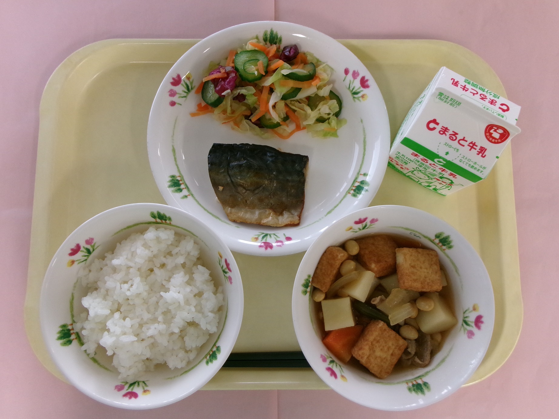 ごはん、牛乳、サバの塩焼き、しば漬けあえ、厚揚げと大豆のうま煮