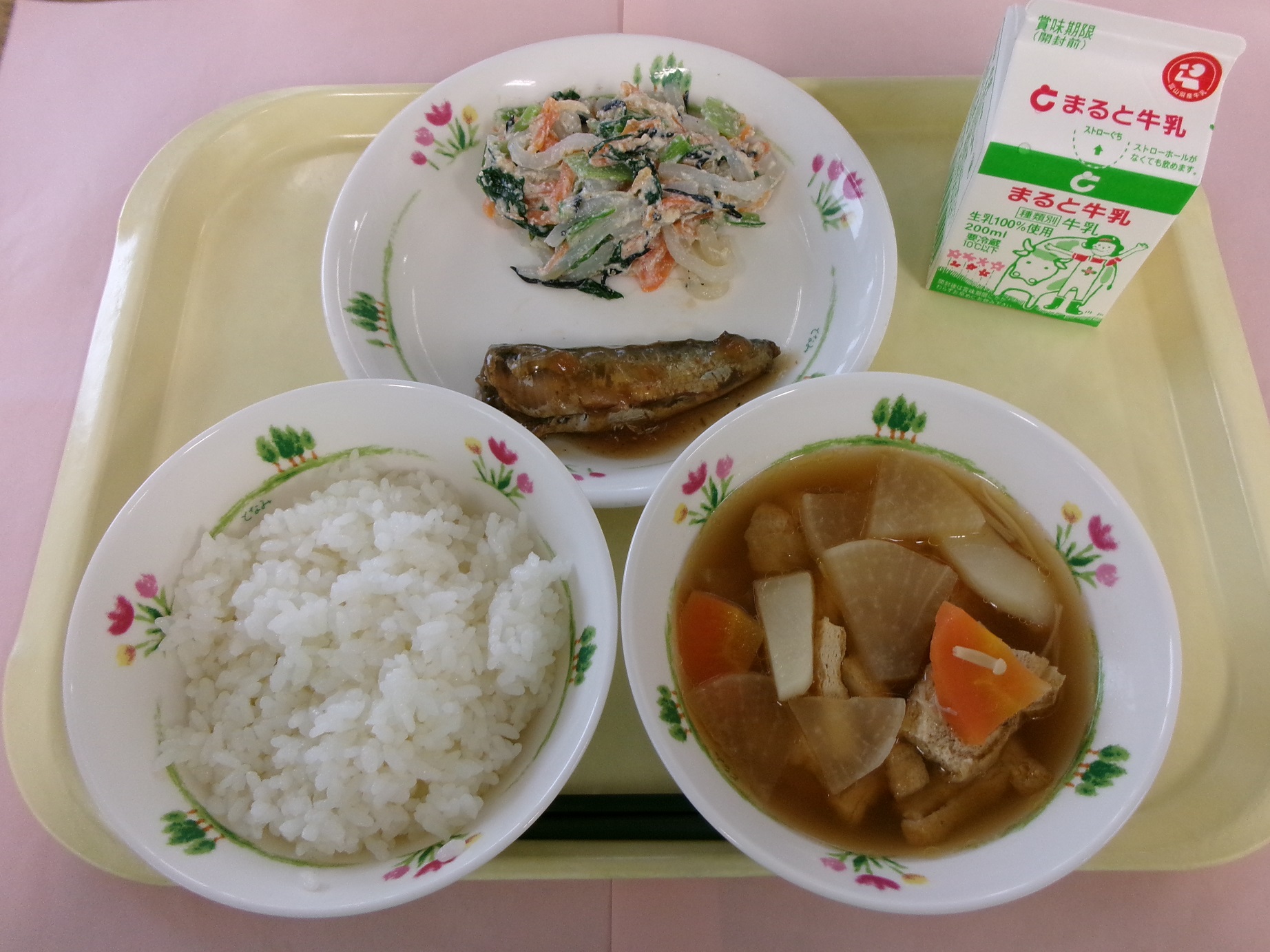 ごはん、牛乳、イワシの梅煮、白和え、根菜汁