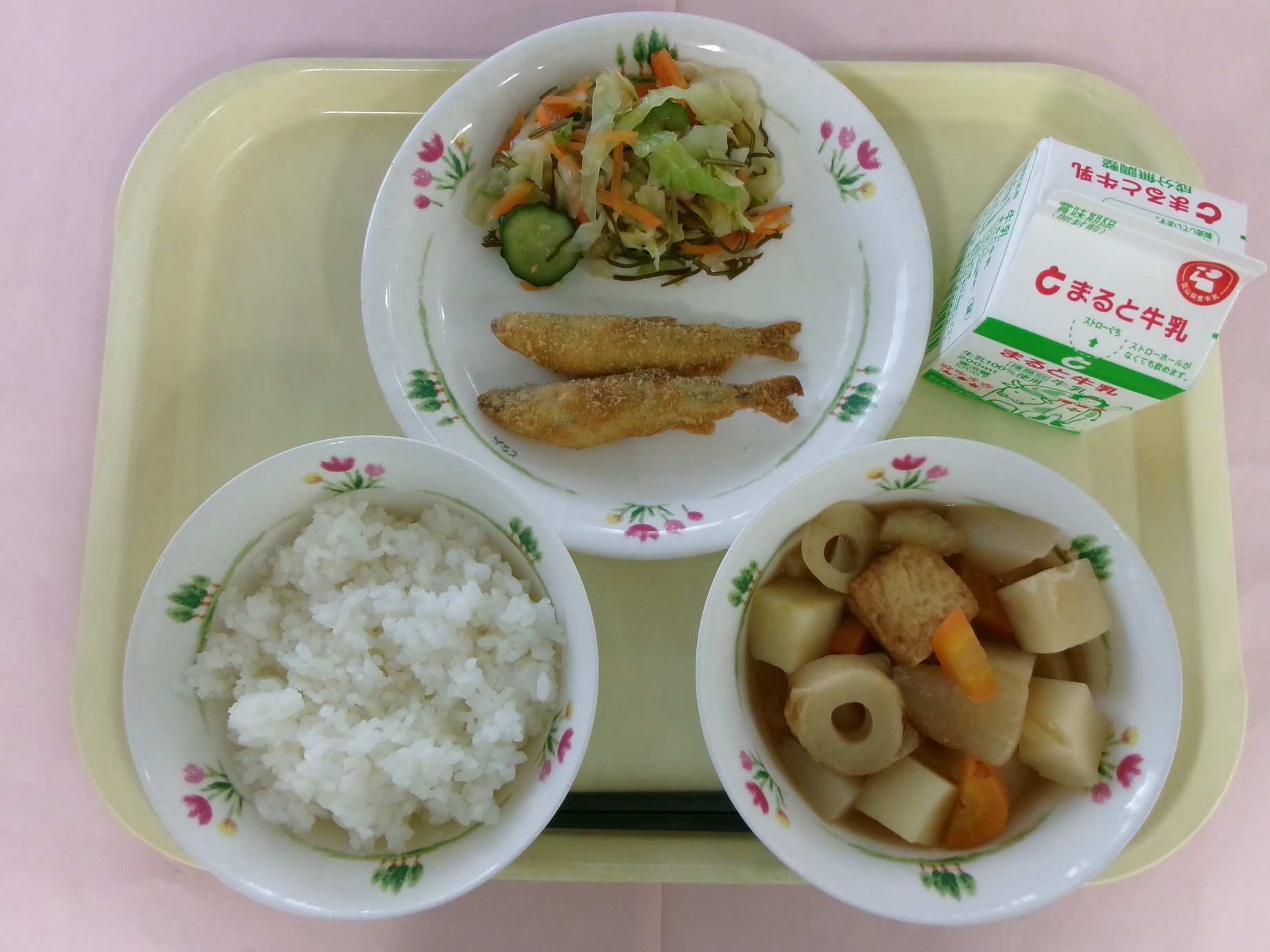 ごはん、牛乳、わかさぎフライ、昆布あえ、おでん