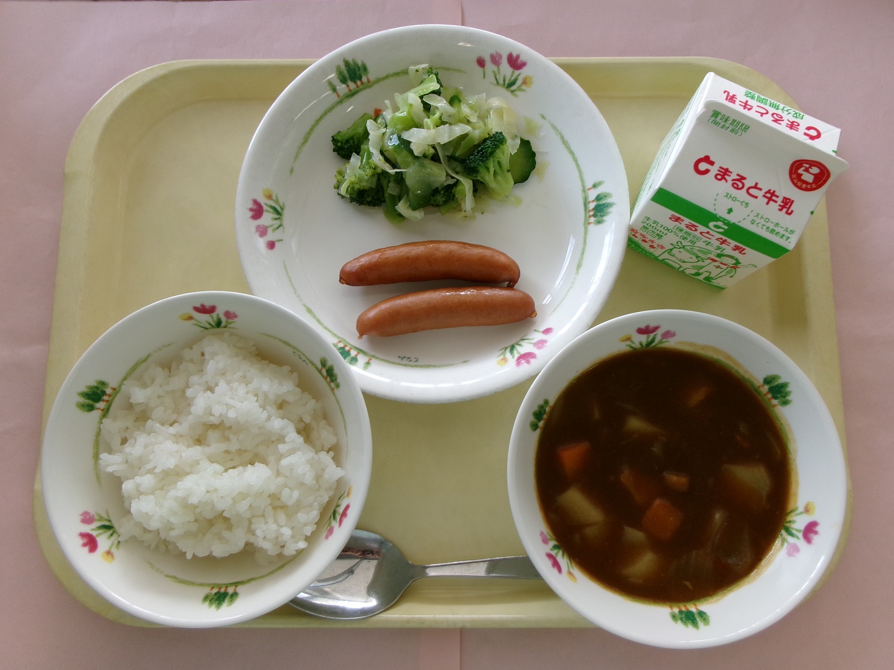 ごはん、牛乳、あらびきウインナー、グリーンサラダ、カレーライス