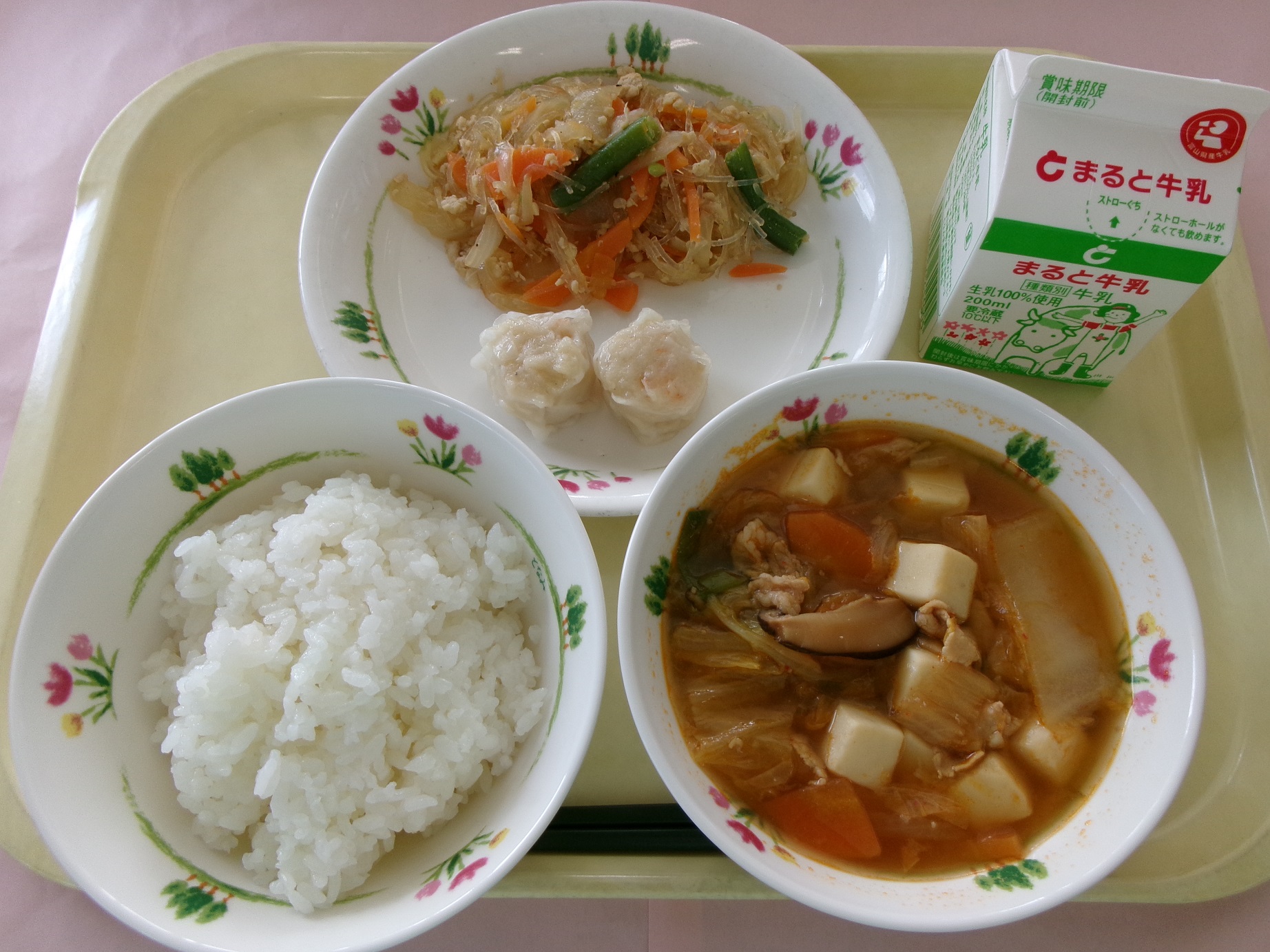 ごはん、牛乳、エビシュウマイ、チャプチェ、キムチ鍋