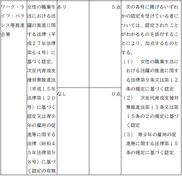 総合評価方式における企業の地域性・社会性の加点項目について、「男女共同参画推進事業所」「ワーク・ライフ・バランス等推進企業」に改正します。