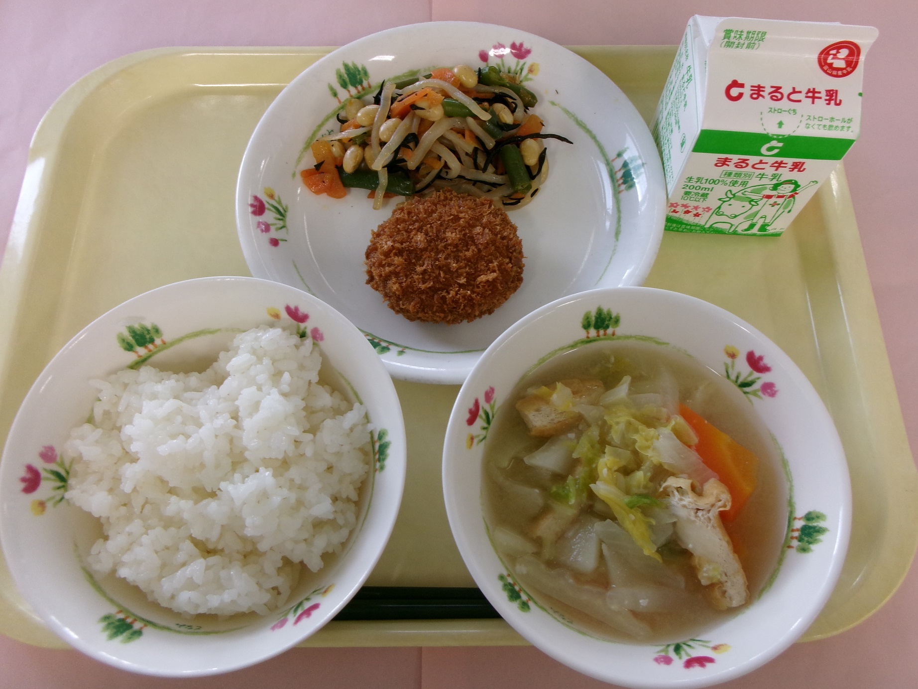 ごはん、牛乳、 メンチカツ、ひじきの炒め煮、白菜のみそ汁