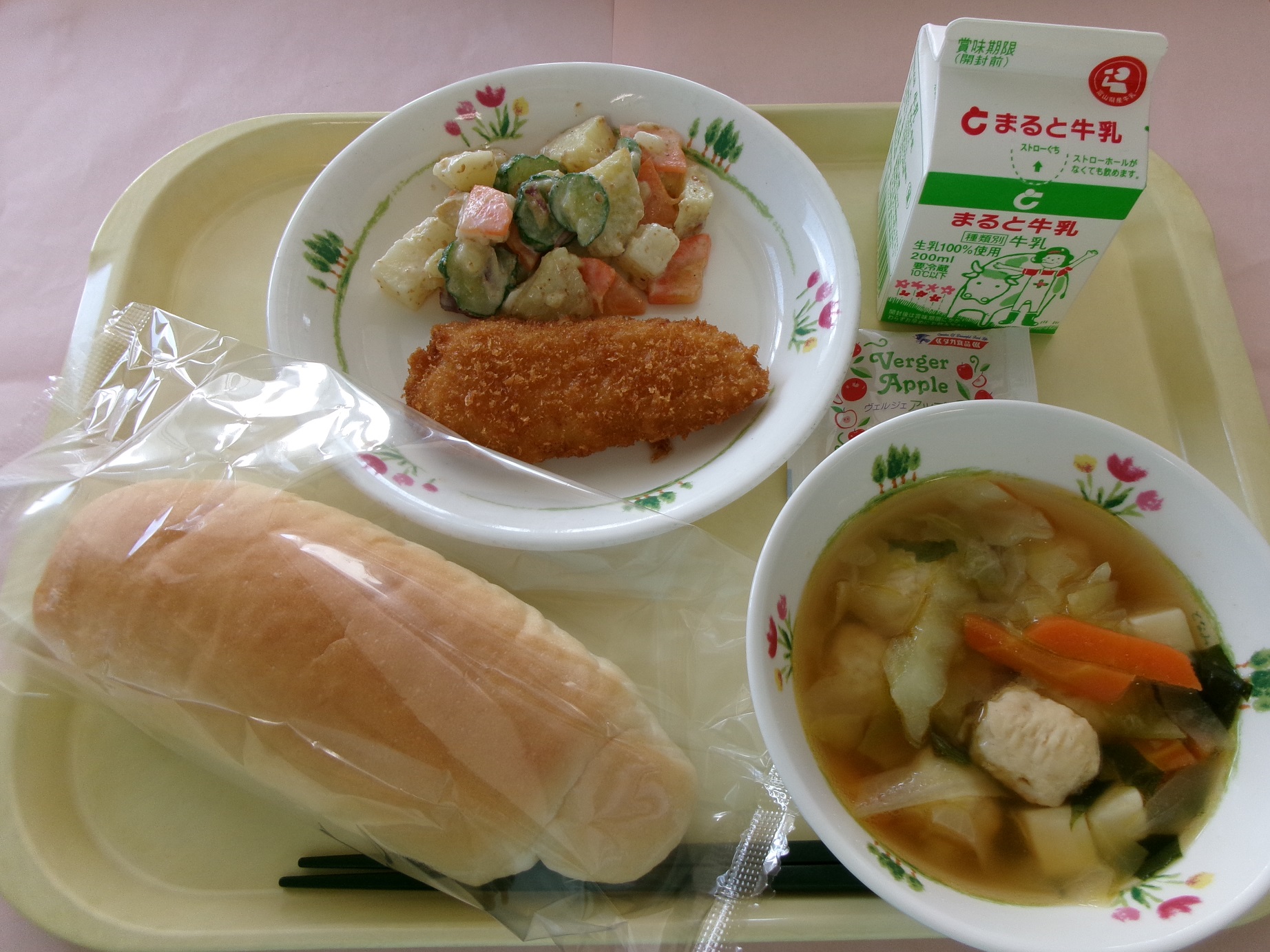 コッペパン、牛乳、白身魚フライ、さつまいもサラダ、わかめスープ、りんごジャム