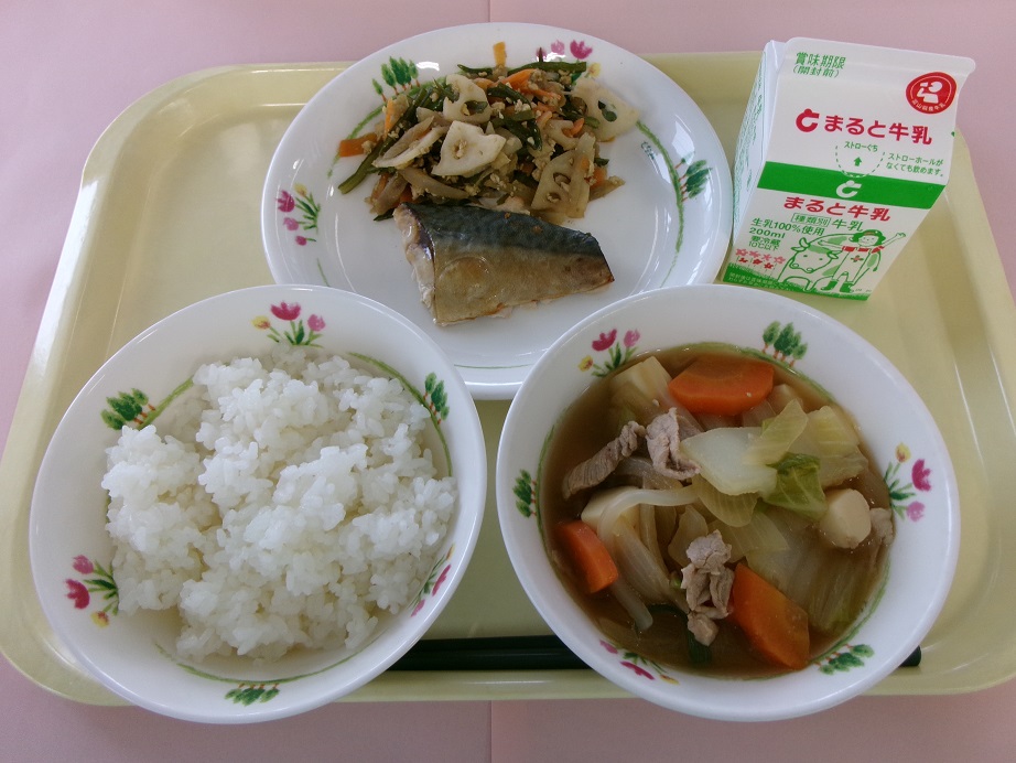 ごはん、牛乳、サバの塩焼き、かみかみきんぴら、すき焼き