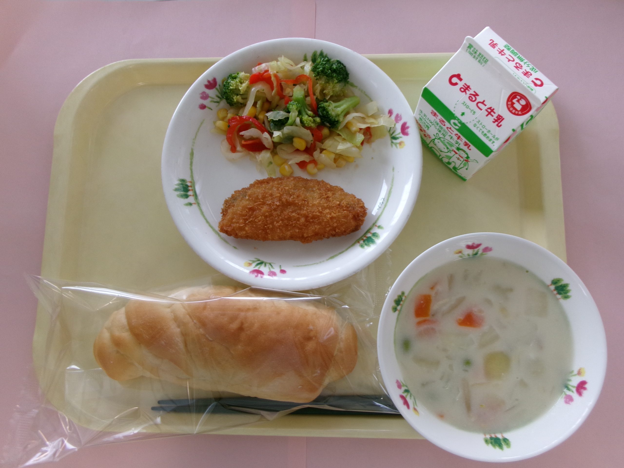 はちみつパン、牛乳、サーモンフライ、カラフルサラダ、ビーンズチャウダー