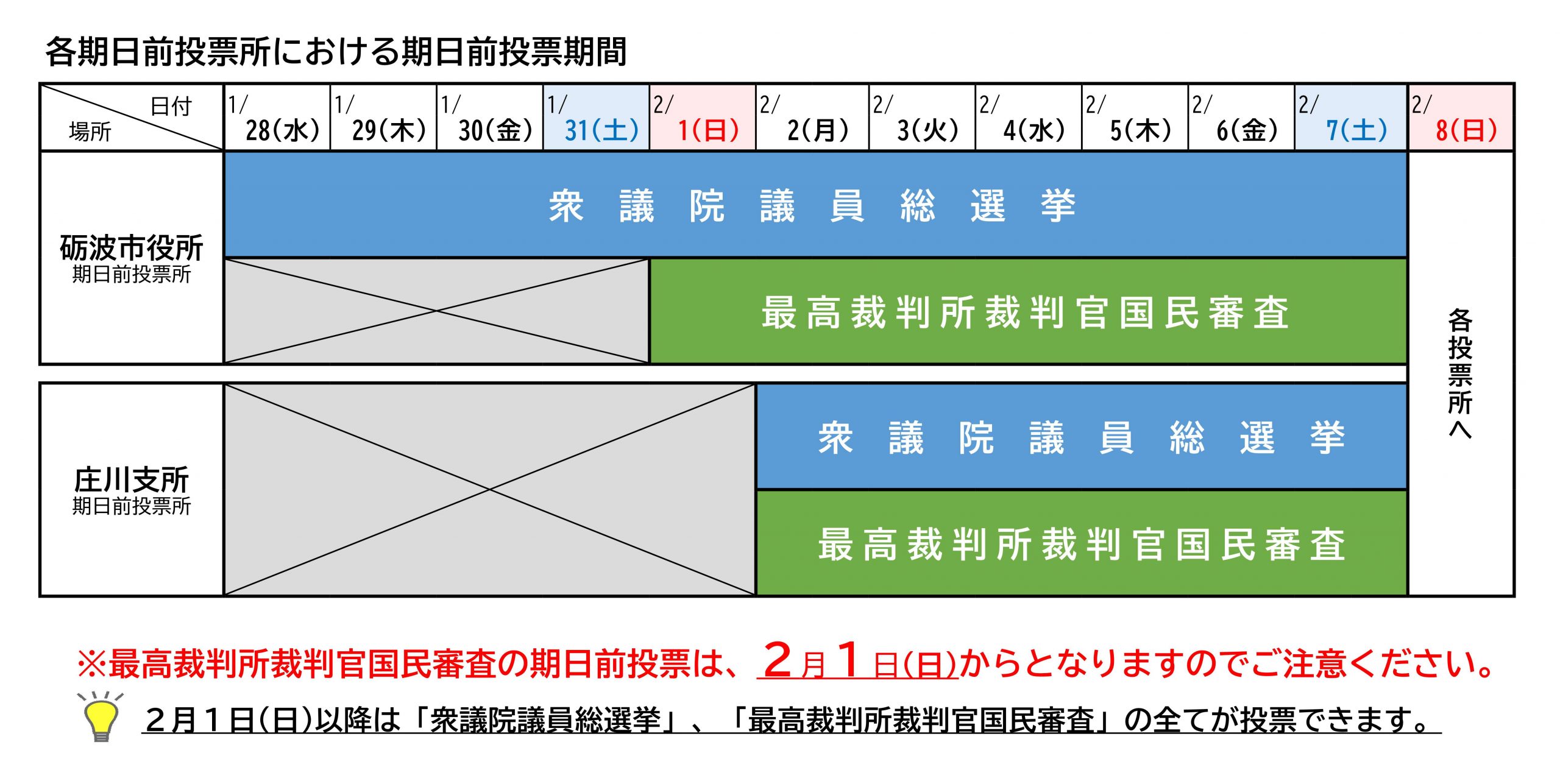 下記のとおり、衆議院議員総選挙と最高裁判所裁判官国民審査の期日前投票期間が異なりますのでご注意ください。