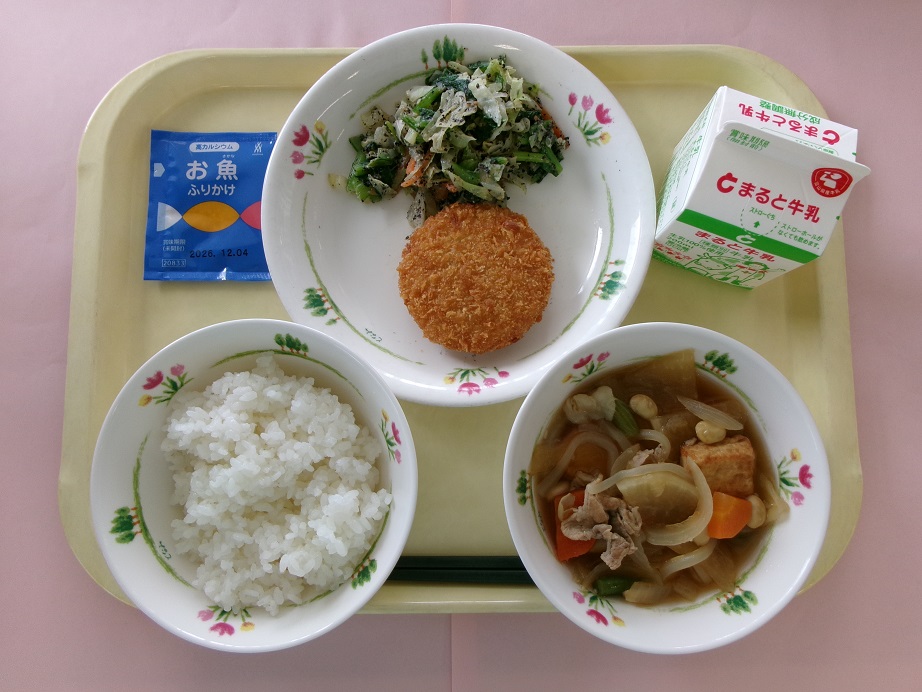 ごはん、牛乳、地場産じゃがいもコロッケ、よごし風ごまあえ、ぶた肉と大豆のうま煮、お魚ふりかけ