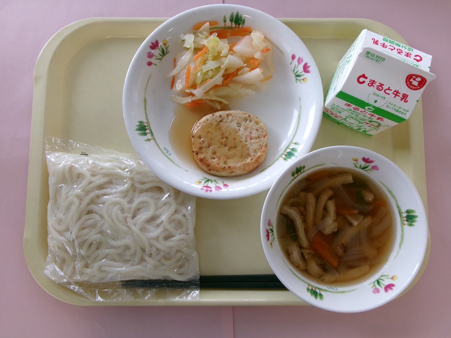 ホットうどん、牛乳、豆腐ハンバーグの和風ソース、かぶのゆず香あえ、五目うどん