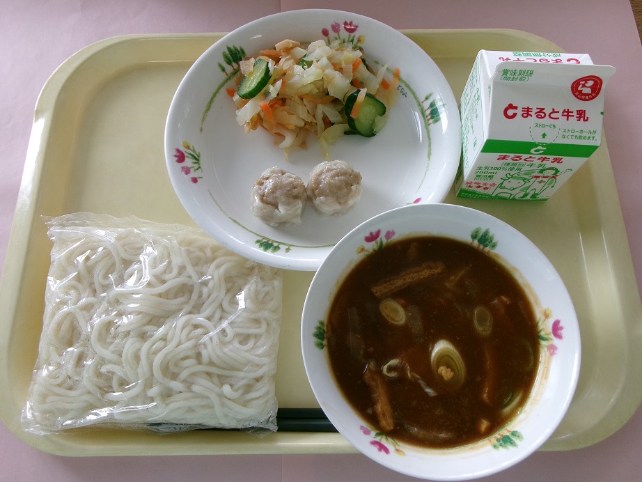 ソフト麺、牛乳、ポークしゅうまい、合わせ漬け、となみの和風カレーソース