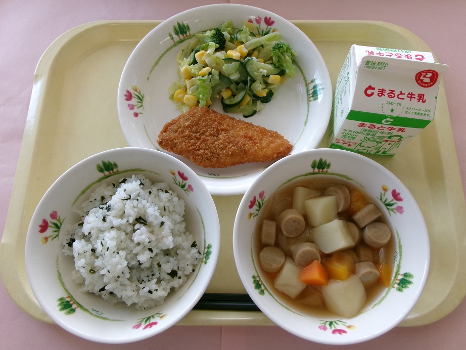 わかめごはん、牛乳、白身魚フライ、コールスローサラダ、ウインナーとポテトのスープ