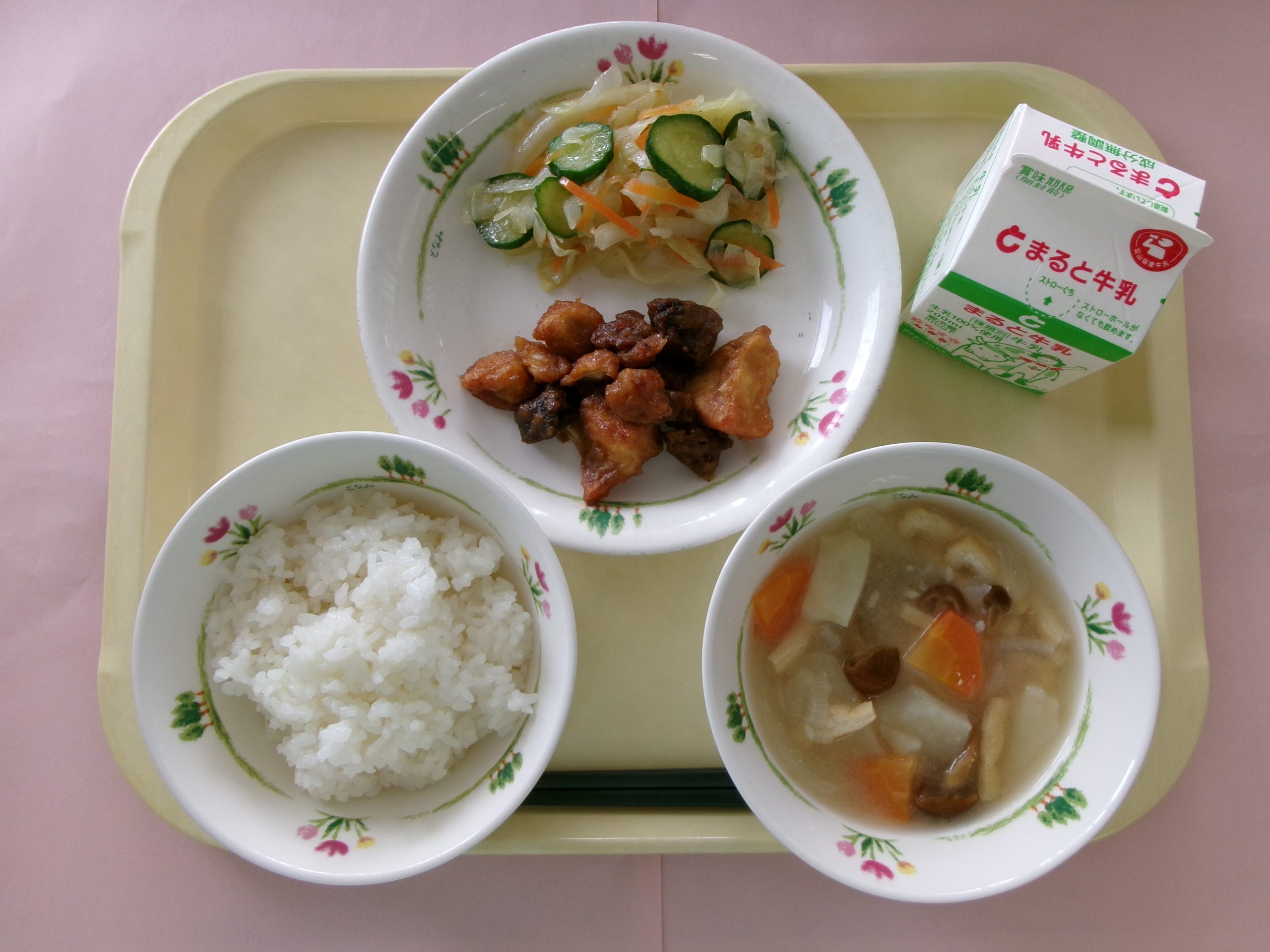 ごはん、牛乳、とり肉とレバーの甘酢からめ、ドレッシングサラダ、なめこのみそ汁