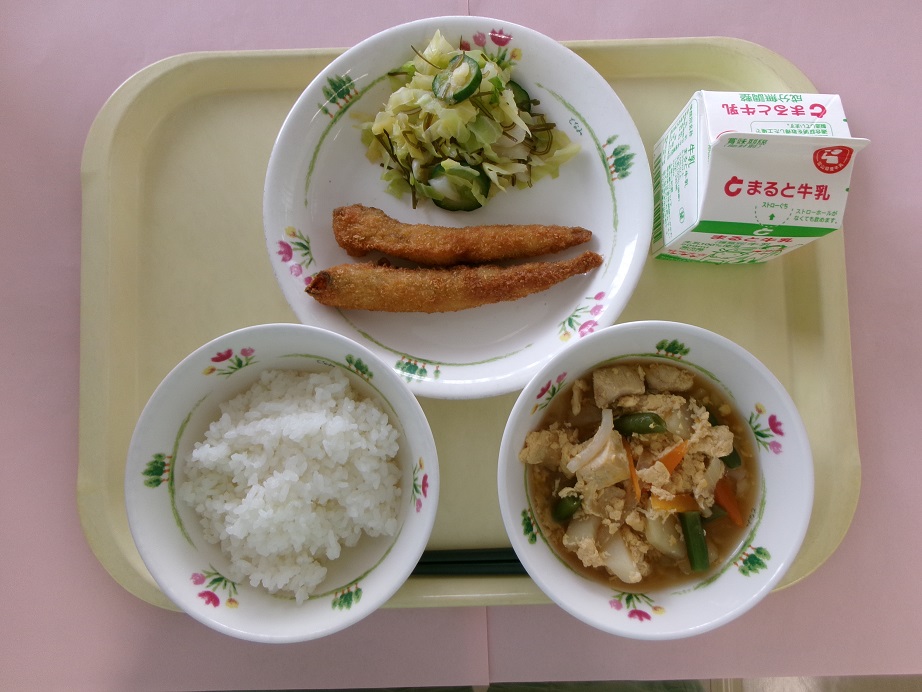 ごはん、牛乳、シシャモフライ、かぶの昆布あえ、親子煮