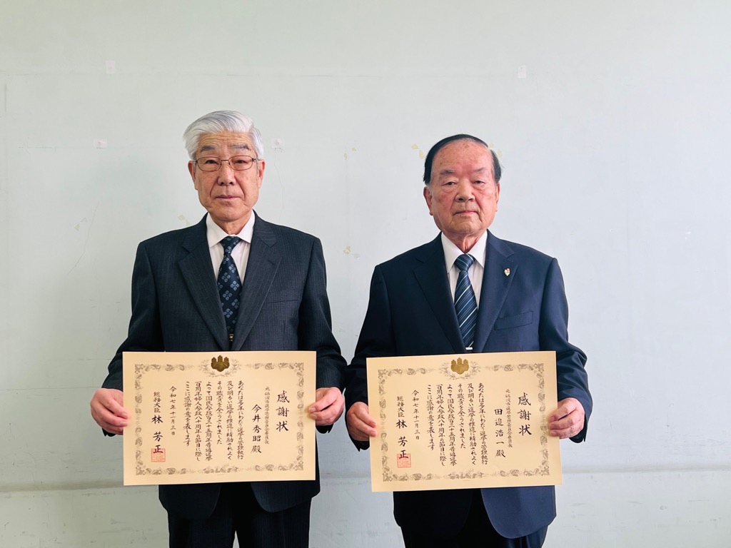 多年にわたり砺波市選挙管理委員会委員としてご尽力いただいた田邉浩一さんと今井秀昭さんに対し、総務大臣から感謝状が贈呈されました。