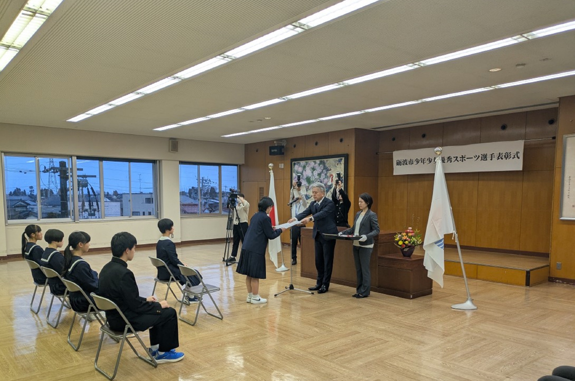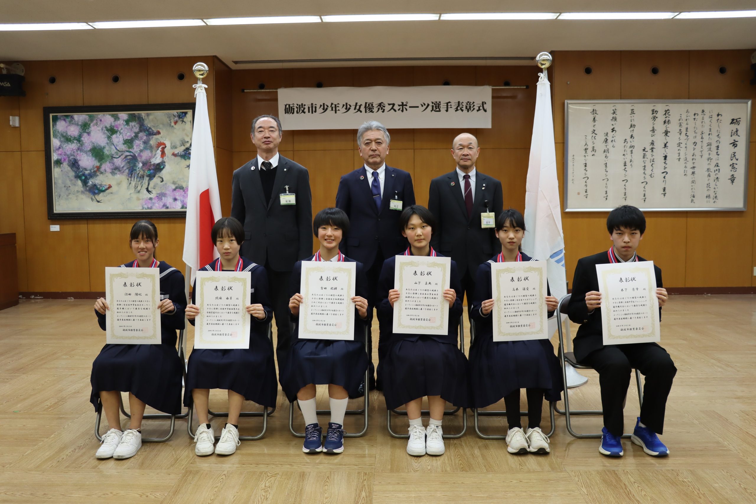 令和8年3月2日(月)砺波市役所大ホールにて「令和7年度砺波市少年少女優秀スポーツ選手表彰式」が執り行われ、スポーツ活動において優秀な成績をおさめた市内小中学生7名を表彰しました。