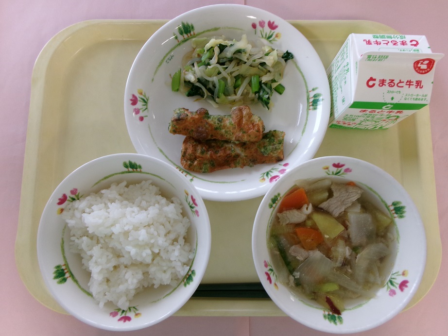 ごはん、牛乳、ちくわの磯辺揚げ、青菜のひたし、ぶた汁